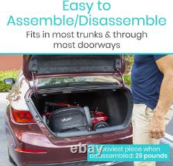 FACILE À TRANSPORTER : Démontez rapidement le scooter de mobilité Vive en quatre pièces séparées pour une portabilité facile. Doté d'un guidon pliable et d'un siège amovible, chaque section s'adapte facilement dans le coffre de véhicules de taille standard. La section arrière pèse seulement 29 livres et est la plus lourde des quatre pièces. PANNEAU DE CONTRÔLE INTUITIF ET FACILE À UTILISER : Situé sur la console du guidon, le panneau de contrôle vous permet de régler la vitesse maximale avec le cadran de vitesse variable, de changer de direction avant à arrière, d'allumer le phare ainsi que de produire un ton d'avertissement si nécessaire.