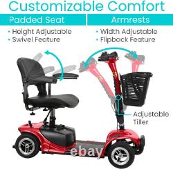 Sa vitesse maximale est de 3,7 mph, et il a une distance de conduite allant jusqu'à 12,4 miles par charge. SIÈGE CONFORTABLE : Confortablement rembourré, le large siège de 15,75 pouces et le dossier offrent un doux rembourrage et un soutien. Le siège pivotant tourne, vous permettant de descendre plus facilement du scooter sans aggraver les douleurs dorsales. Le siège réglable en hauteur peut facilement être personnalisé d'un simple coup de levier, pour un meilleur ajustement. Le scooter dispose également de deux accoudoirs rembourrés qui s'ajustent et se replient vers le haut, pour plus de commodité lors de la montée ou de la descente.